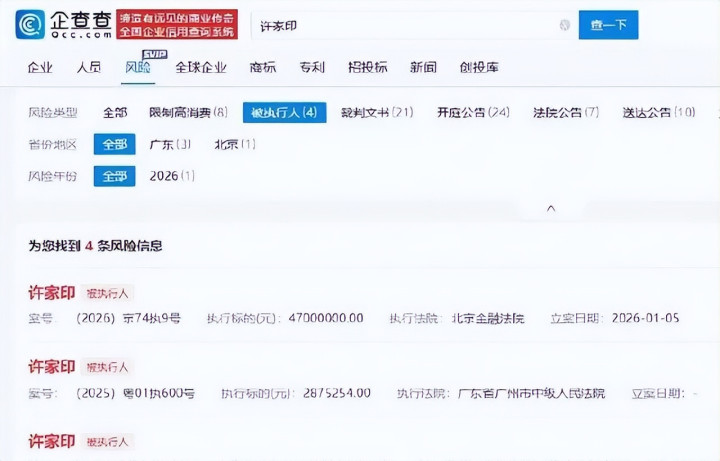 北京金融法院刚在2026年1月5日对许家印下了强制执行令,金额是4700万元,这笔钱直接来自两年前证监会的罚单。原来是恒大地产在债券发行和财务报告上出了岔子,监管部门查出他们2019到2020年间的数据有水分。