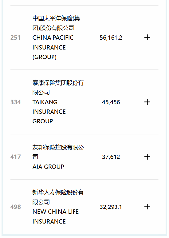 保险领域,中国人寿保险(集团)公司(第45位)、中国平安保险(集团)股份有限公司(第47位)、中国人民保险集团股份有限公司(第141位)、中国太平洋保险(集团)股份有限公司(第251位)、泰康保险集团股份有限公司(第334位)、友邦保险控股有限公司(第417位)、新华人寿保险股份有限公司(第498位)7家中国保险机构上榜。